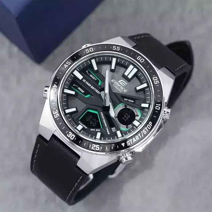 - Caja y correa: Tiene una caja de acero inoxidable con un bisel graduado y una correa de cuero sintético en color negro con pespuntes, lo que le da una apariencia sofisticada.
